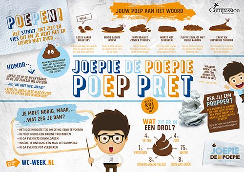 Compassion levert kosteloos de volgende materialen: wikkels voor om de wc-rollen, posters, een powerpoint, filmpjes en natuurlijk de gastles van de ‘hygiëneprofessor’.
