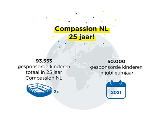 25 jaar geleden was Compassion een organisatie die vooral opereerde in Angelsaksische landen: Amerika, Canada, Australië en Engeland. De wens leefde om in meer landen sponsors te vinden. Nederland werd het bruggenhoofd naar Europa. Sinds het allereerste begin zijn vanuit Nederland in totaal 93.553 unieke kinderen gesponsord. Met dat aantal zijn de zitplaatsen van zowel het Ajax- als het PSV-stadion ruimschoots gevuld.