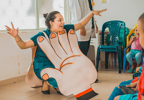 Maria, projectmedewerker (Colombia): “Voor de lockdown leerden we de kinderen op het project spelenderwijs hoe je kunt voorkomen dat je besmet wordt met COVID-19. De lessen verzorgen we nu aan huis voor het hele gezin en natuurlijk doen de buren dan gewoon mee.”