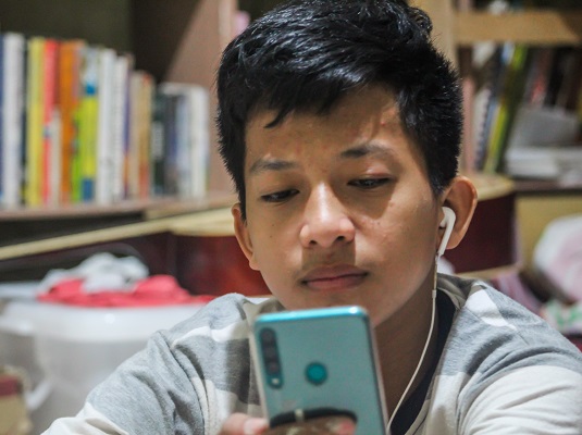M-jay volgt op zijn mobiel een online training van pastor Andy