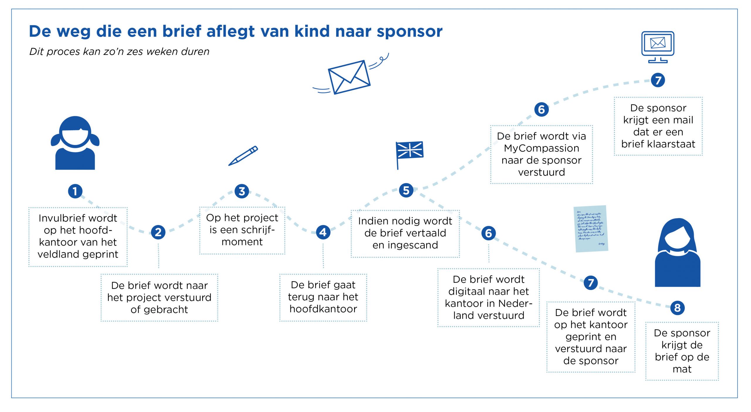 Infographic over de weg die een brief afleggt van sponsor naar kind.